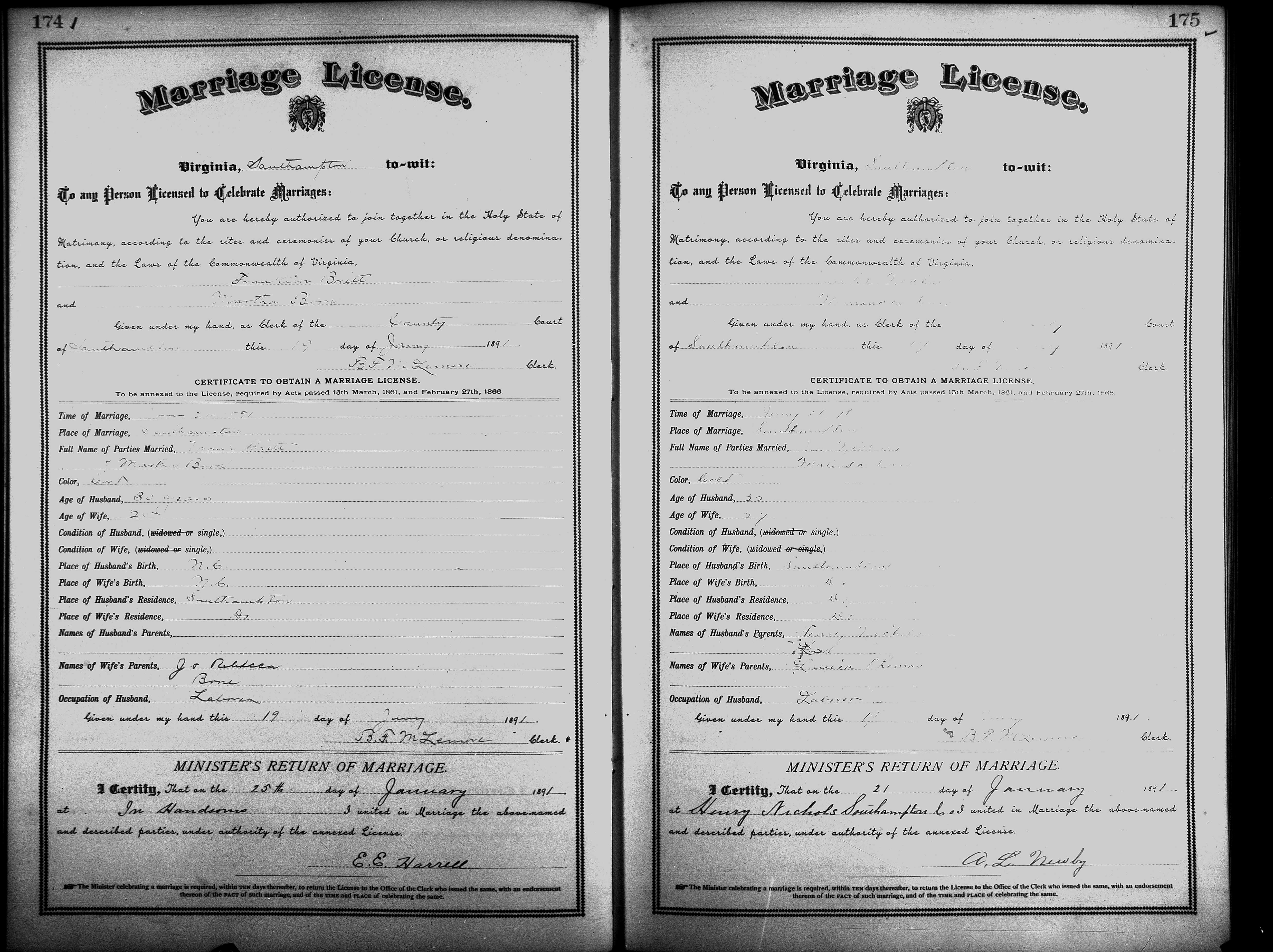 Showing /Marriage Books/Marriage Book 7 1890-1893/Pg 174.jpg