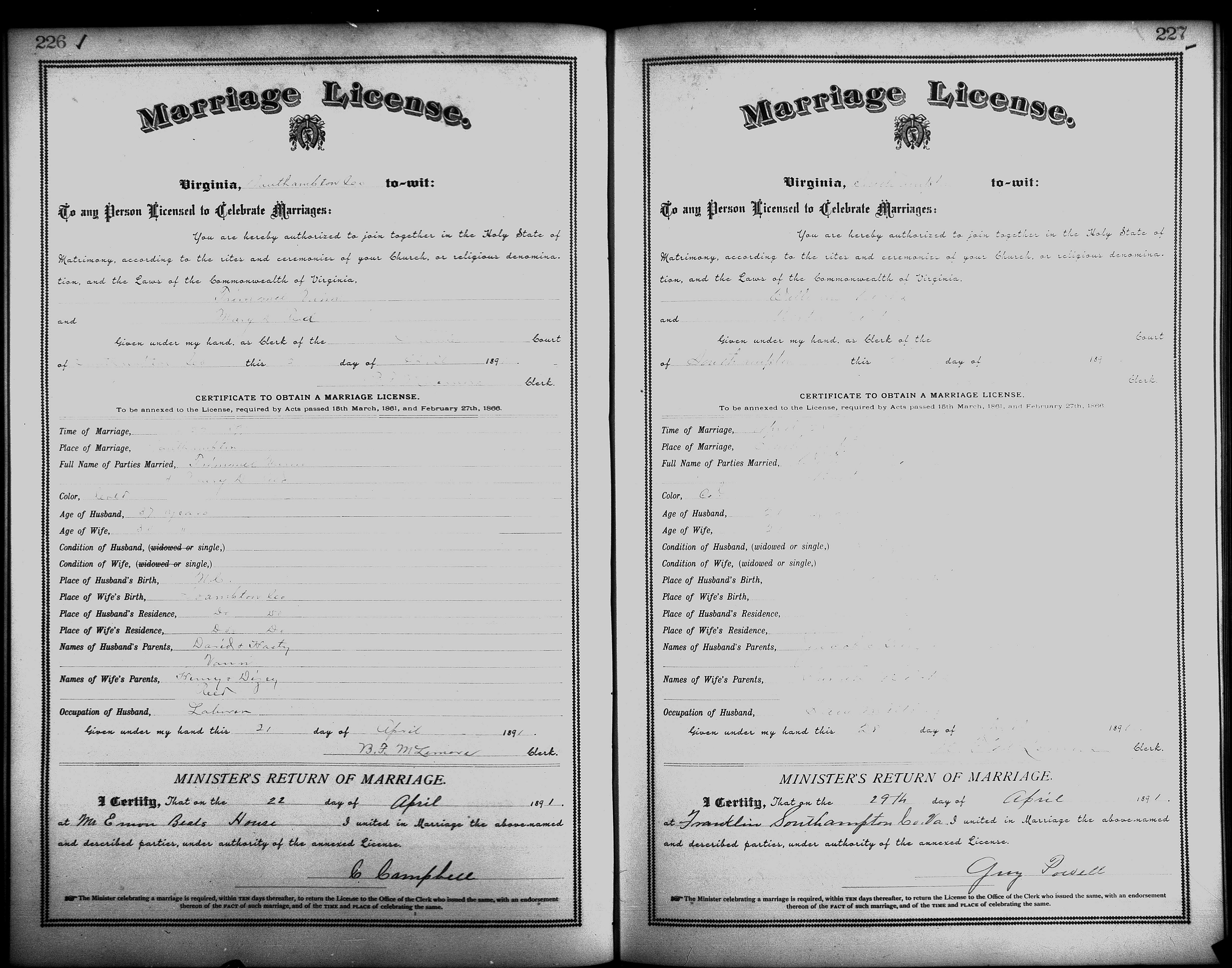 Showing /Marriage Books/Marriage Book 7 1890-1893/Pg 226.jpg