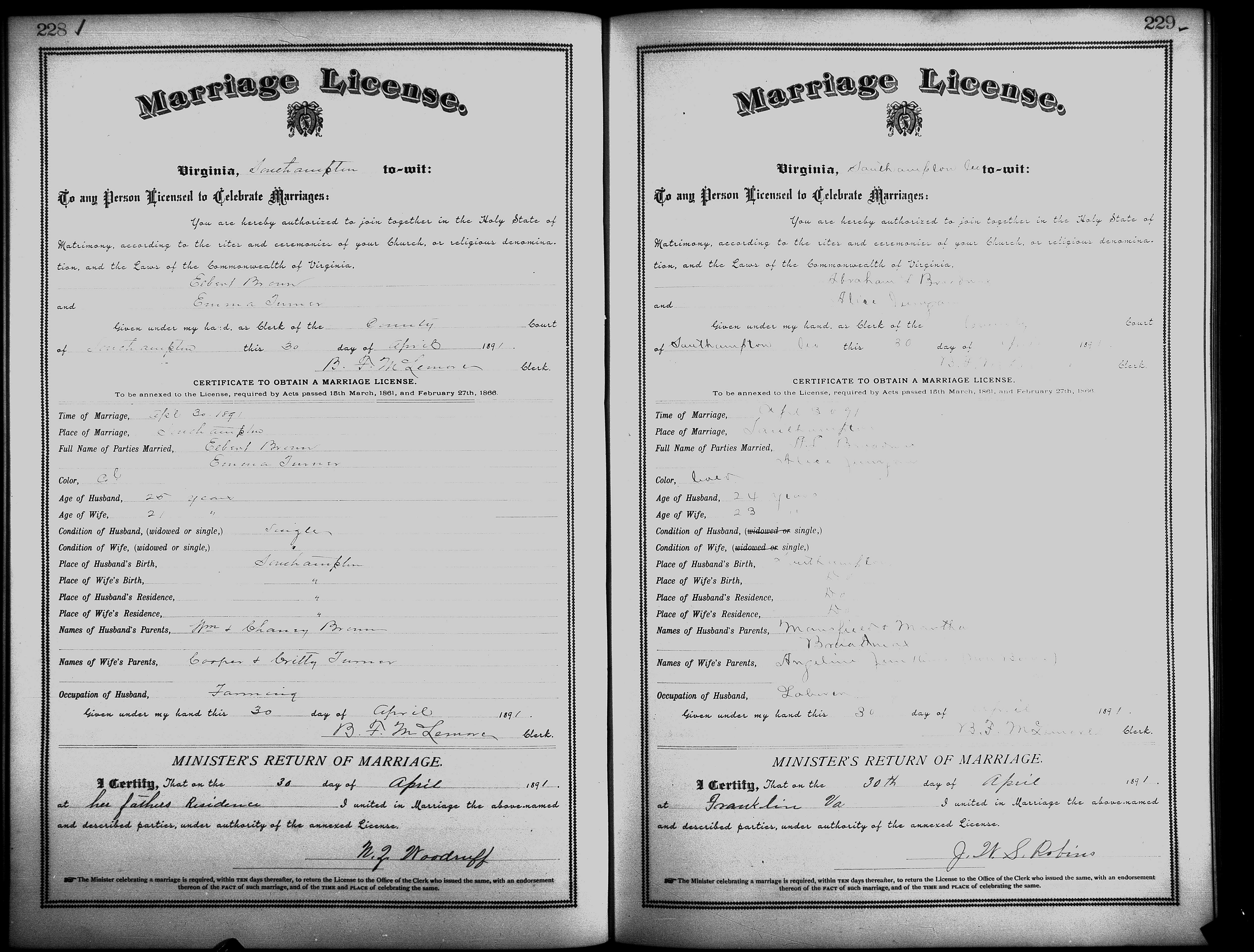 Showing /Marriage Books/Marriage Book 7 1890-1893/Pg 229.jpg